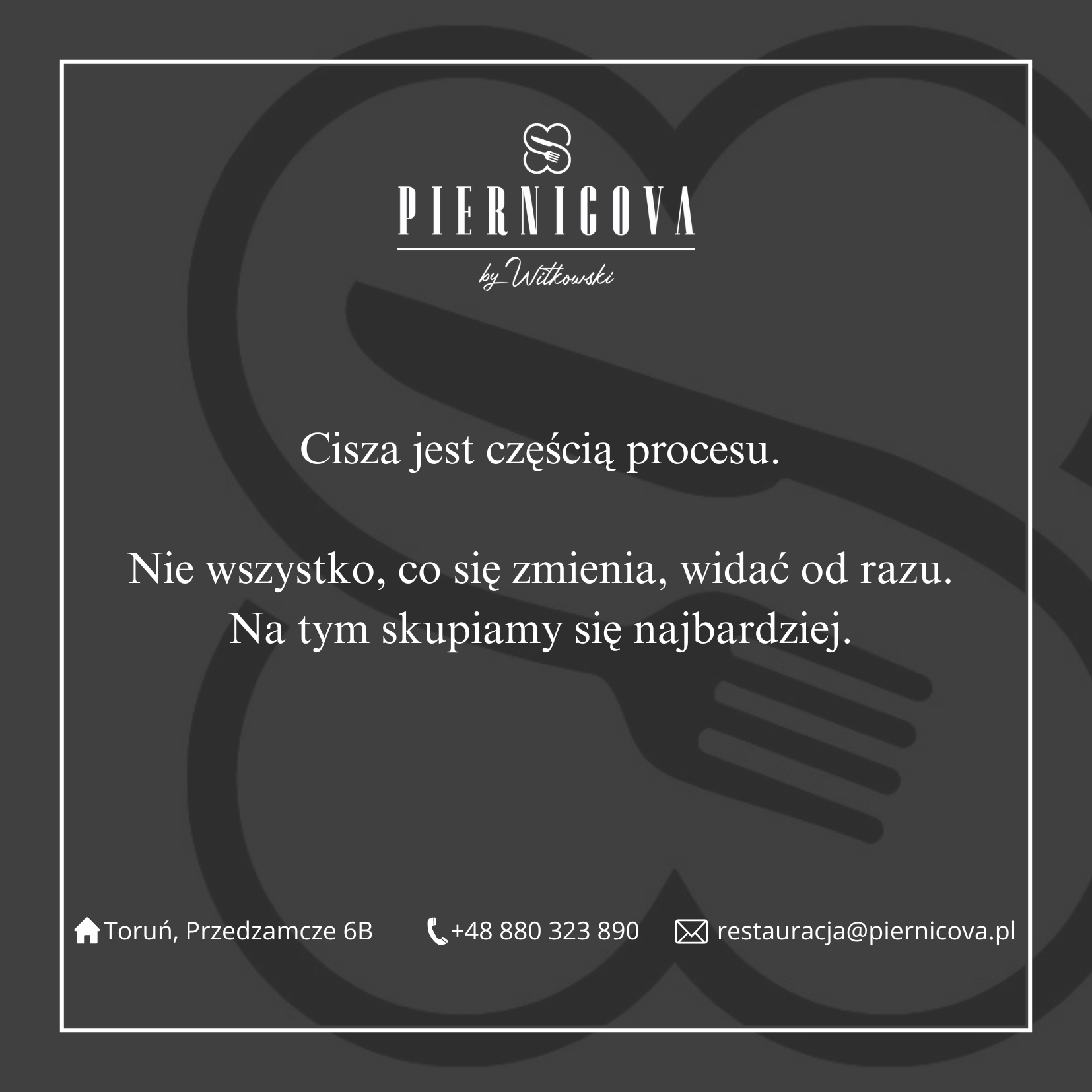 Restauracja Piernicova powstała w 2019 roku, mieści się w zabytkowej części miasta – w samym środku gotyckiej starówki. Nagrodzona w prestiżowym plebiscycie Poland 100 Best Restaurant, a także w konkursie Polskie Skarby Kulinarne.